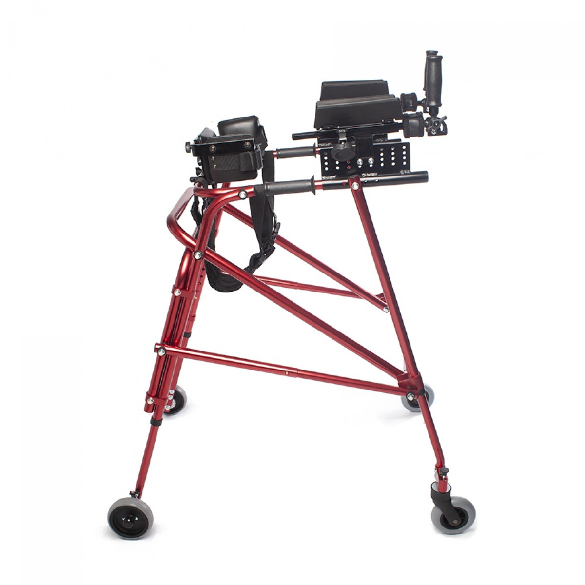 Ходунки легко адаптируются под ребёнка: можно отрегулировать высоту и настроить элементы поддержки под индивидуальные особенности. Дополнительные фиксаторы корпуса и таза помогают удерживать стабильное положение, а подлокотники дают уверенную опору при движении. Модель подходит для использования как в процессе реабилитации, так и в повседневной активности.