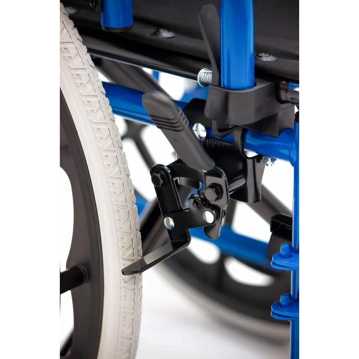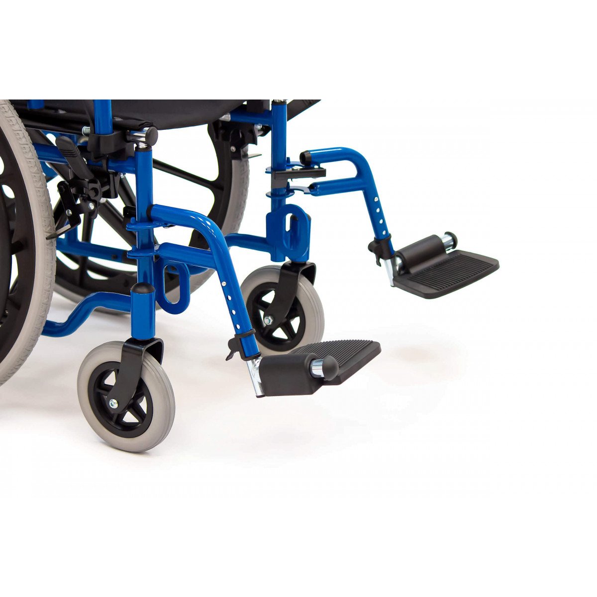 Сиденье и спинка выполнены из прочного нейлона, который устойчив к износу и прост в уходе. Литые колёса не требуют обслуживания и обеспечивают надёжность в ежедневном использовании. Для безопасной остановки предусмотрены боковые стояночные тормоза.
