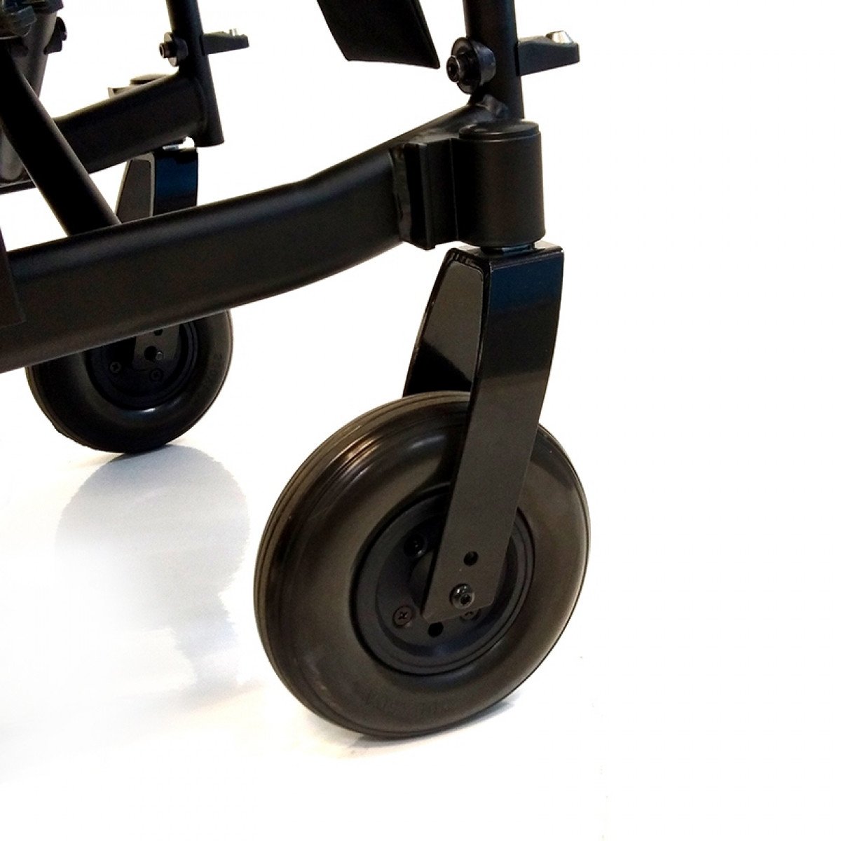 Коляска легко подстраивается под пользователя: спинка регулируется по углу наклона и дополнительно усилена ремнями натяжения и распоркой для стабильной поддержки. Сиденье и спинка оснащены съёмными мягкими подушками из дышащего материала, который не растягивается и прост в уходе. Подлокотники регулируются по высоте и ширине, а подножки — по длине, при необходимости откидываются или снимаются для удобной посадки.