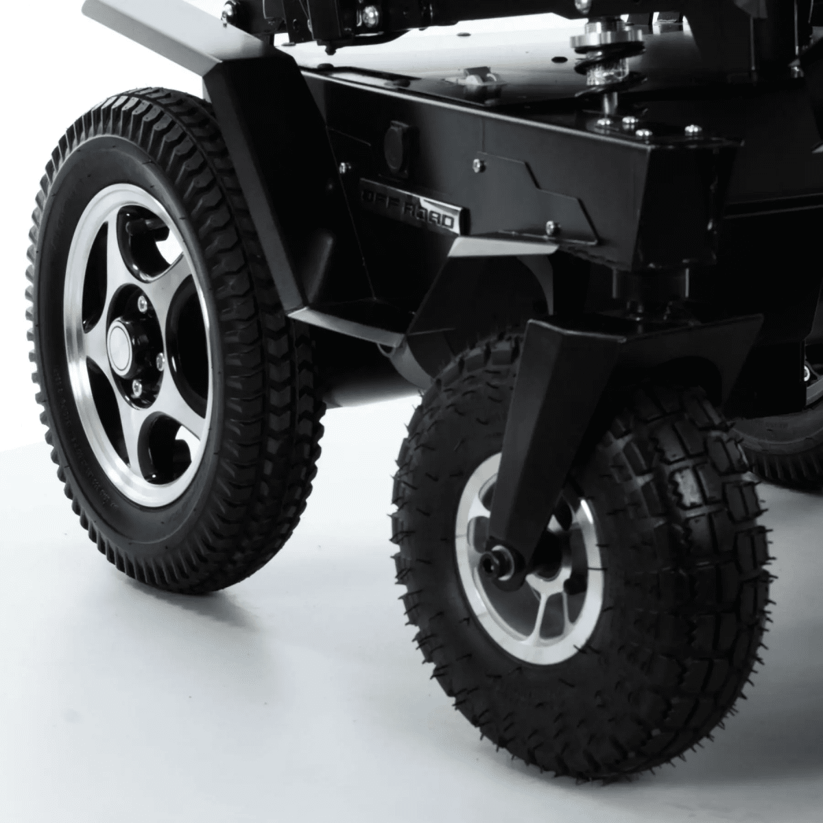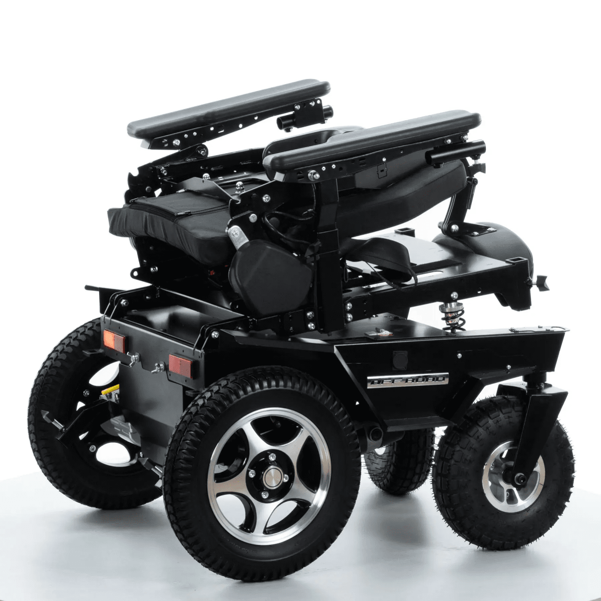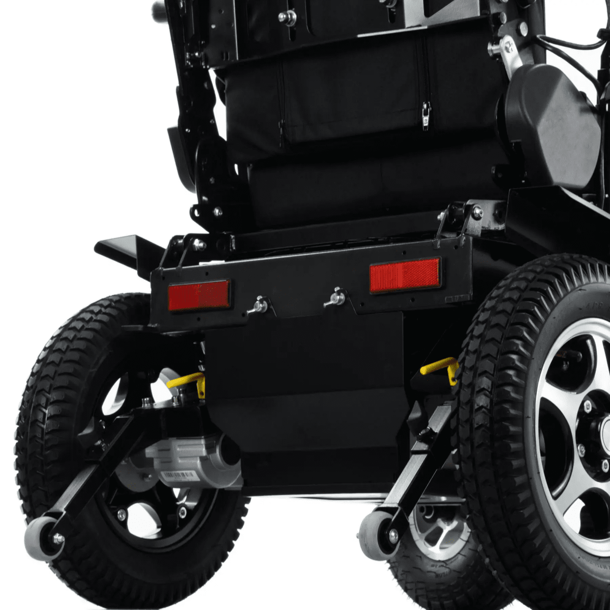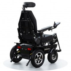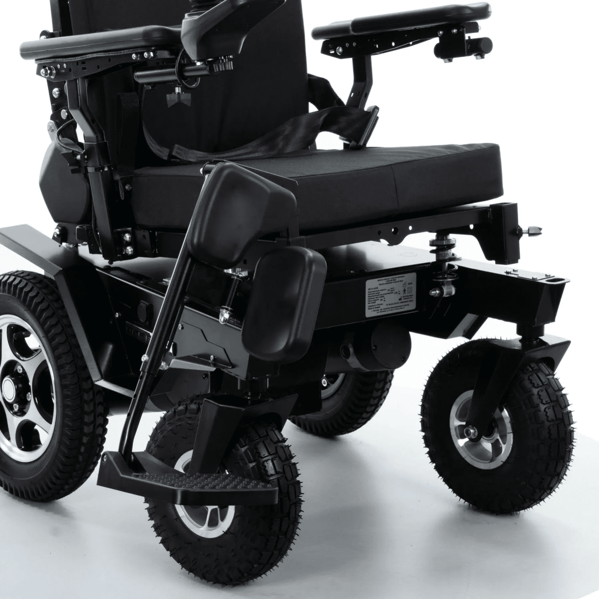 Коляска оснащена мощными двигателями и большими передними колёсами, которые помогают уверенно ехать по неровным поверхностям. Независимая подвеска и амортизаторы снижают вибрацию при движении, а скорость до 10 км/ч позволяет спокойно преодолевать длинные расстояния.