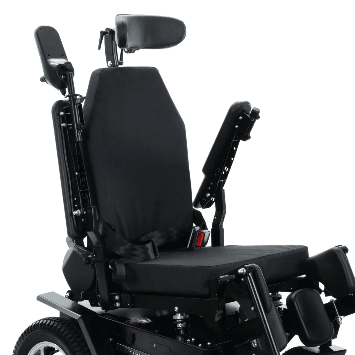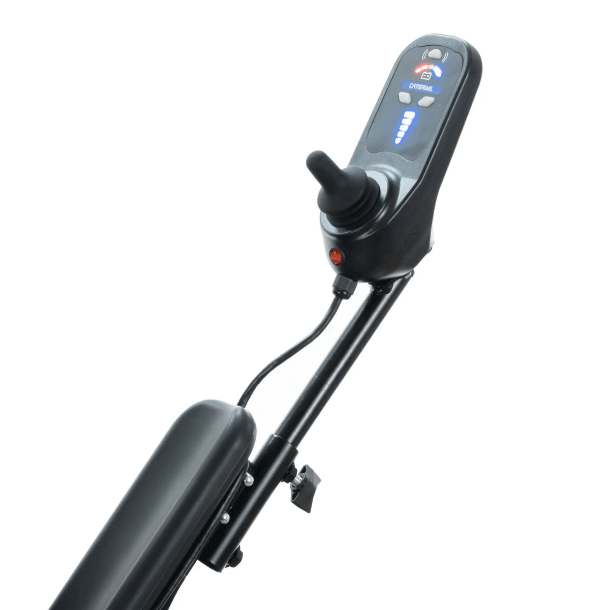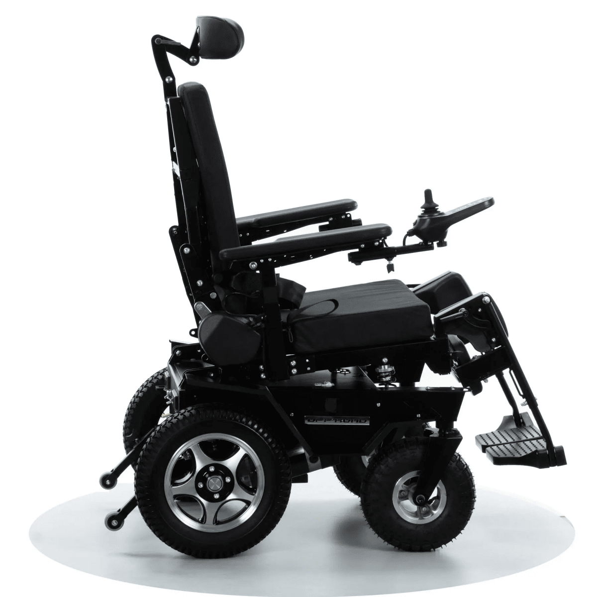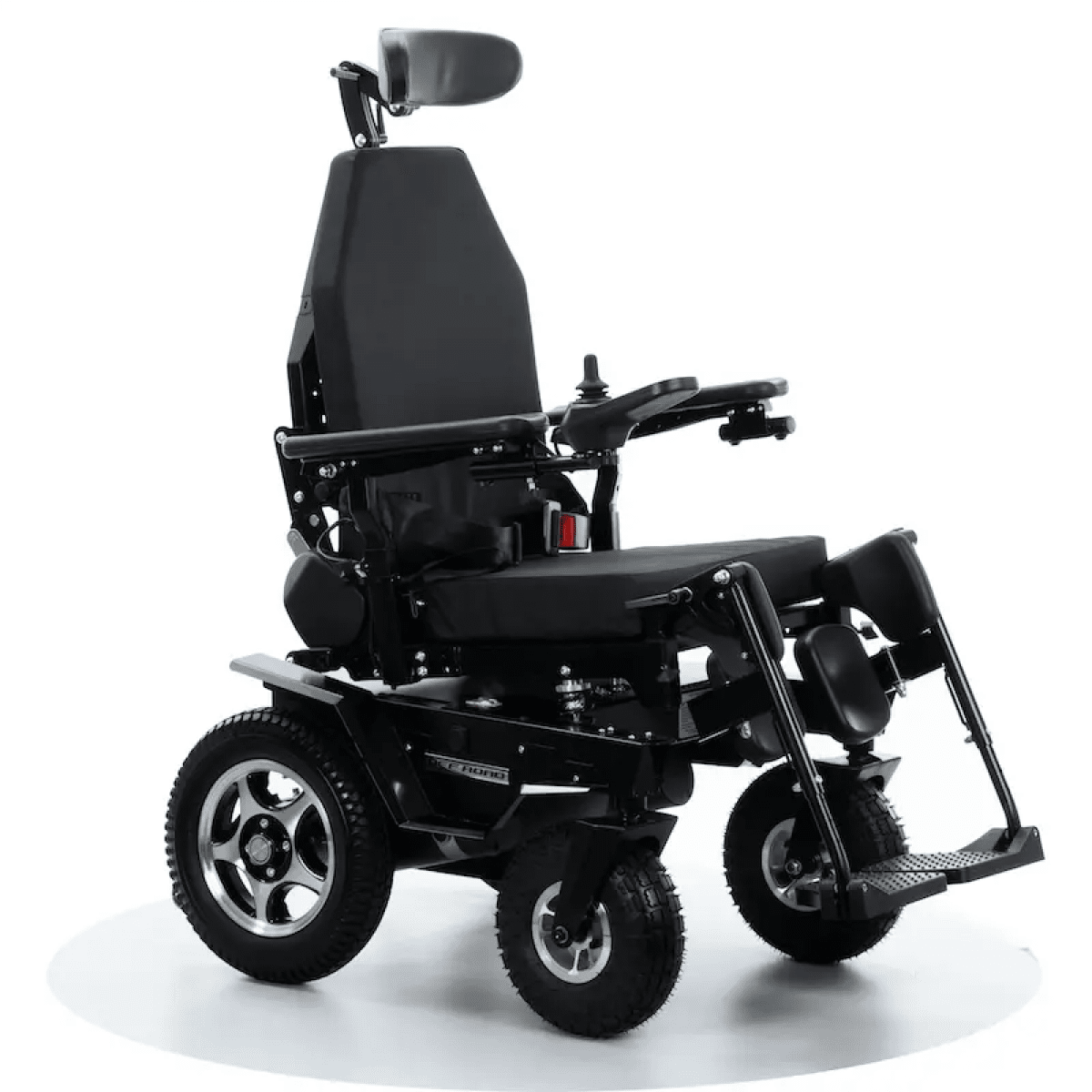 Коляска оснащена мощными двигателями и большими передними колёсами, которые помогают уверенно ехать по неровным поверхностям. Независимая подвеска и амортизаторы снижают вибрацию при движении, а скорость до 10 км/ч позволяет спокойно преодолевать длинные расстояния.