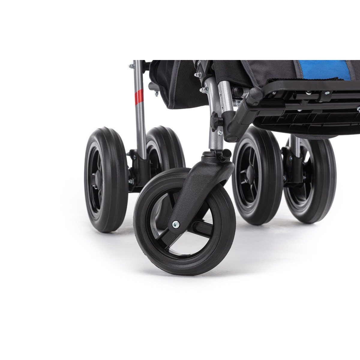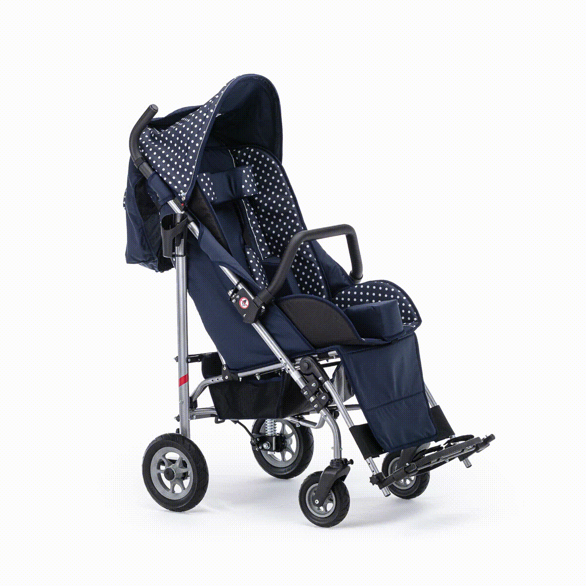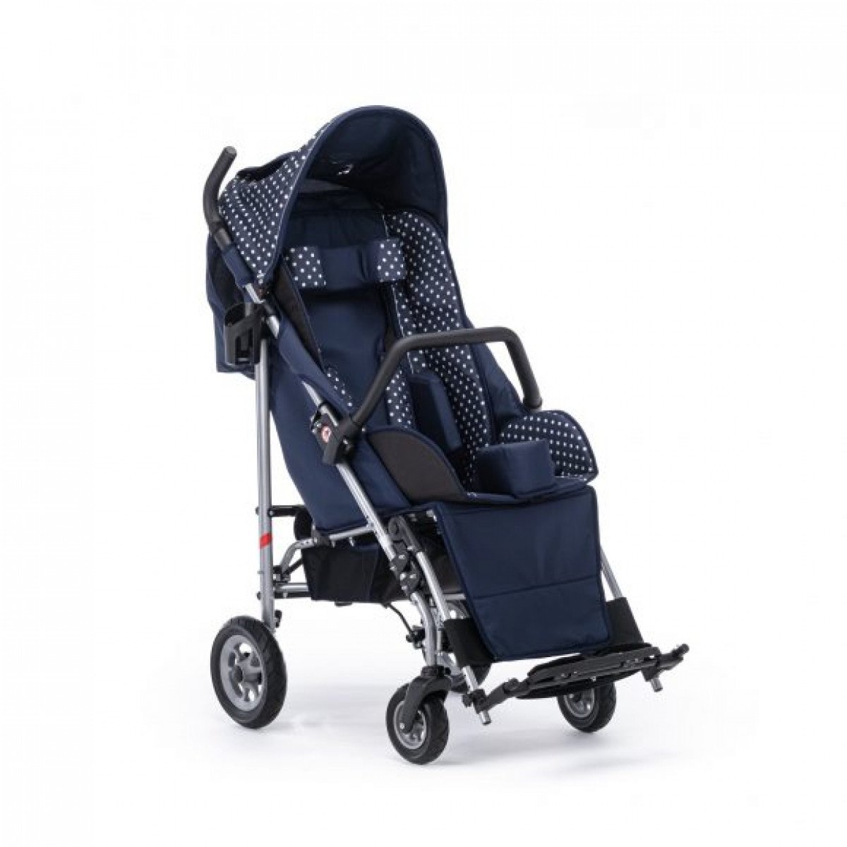 Коляска хорошо маневрирует и легко управляется благодаря поворотным колёсам. Спинка плавно регулируется, позволяя выбрать комфортное положение — от активного сидения до отдыха. Подножка подстраивается под рост ребёнка, а абдуктор помогает удерживать правильное положение таза. Все элементы поддержки продуманы так, чтобы снизить нагрузку и обеспечить стабильную посадку.