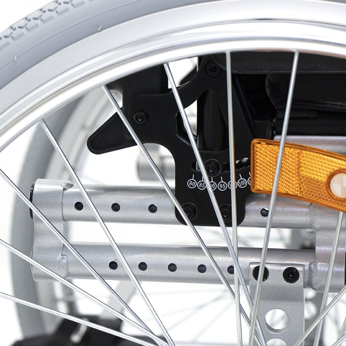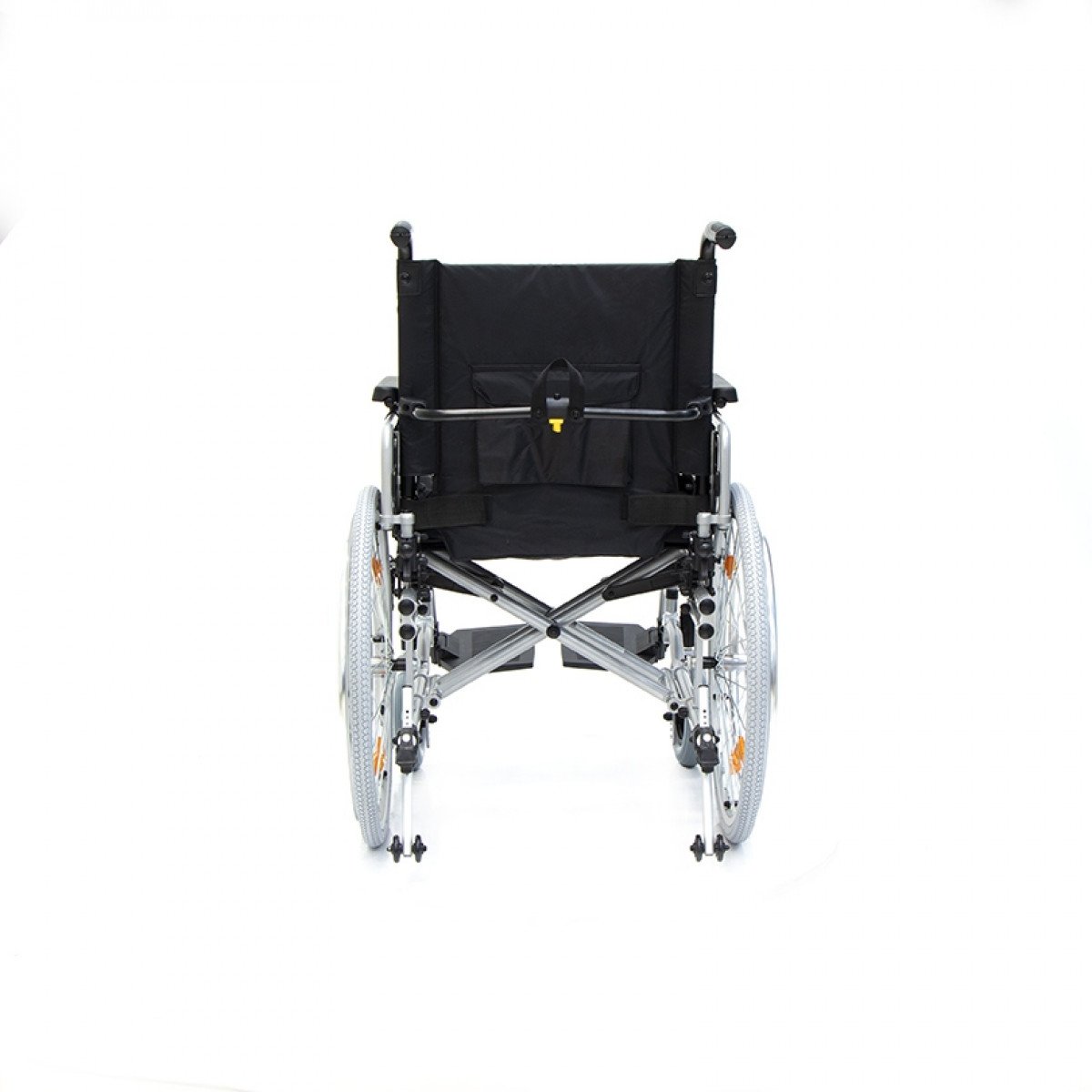 Коляска оснащена передними цельнолитыми колёсами с регулировкой по высоте и задними пневматическими колёсами, которые можно быстро снять и отрегулировать под пользователя. Складная рама из алюминия облегчает хранение и транспортировку. Для безопасности предусмотрены стояночные тормоза, жёсткая фиксация спинки и антиопрокидыватели с регулировкой, которые повышают устойчивость при движении.