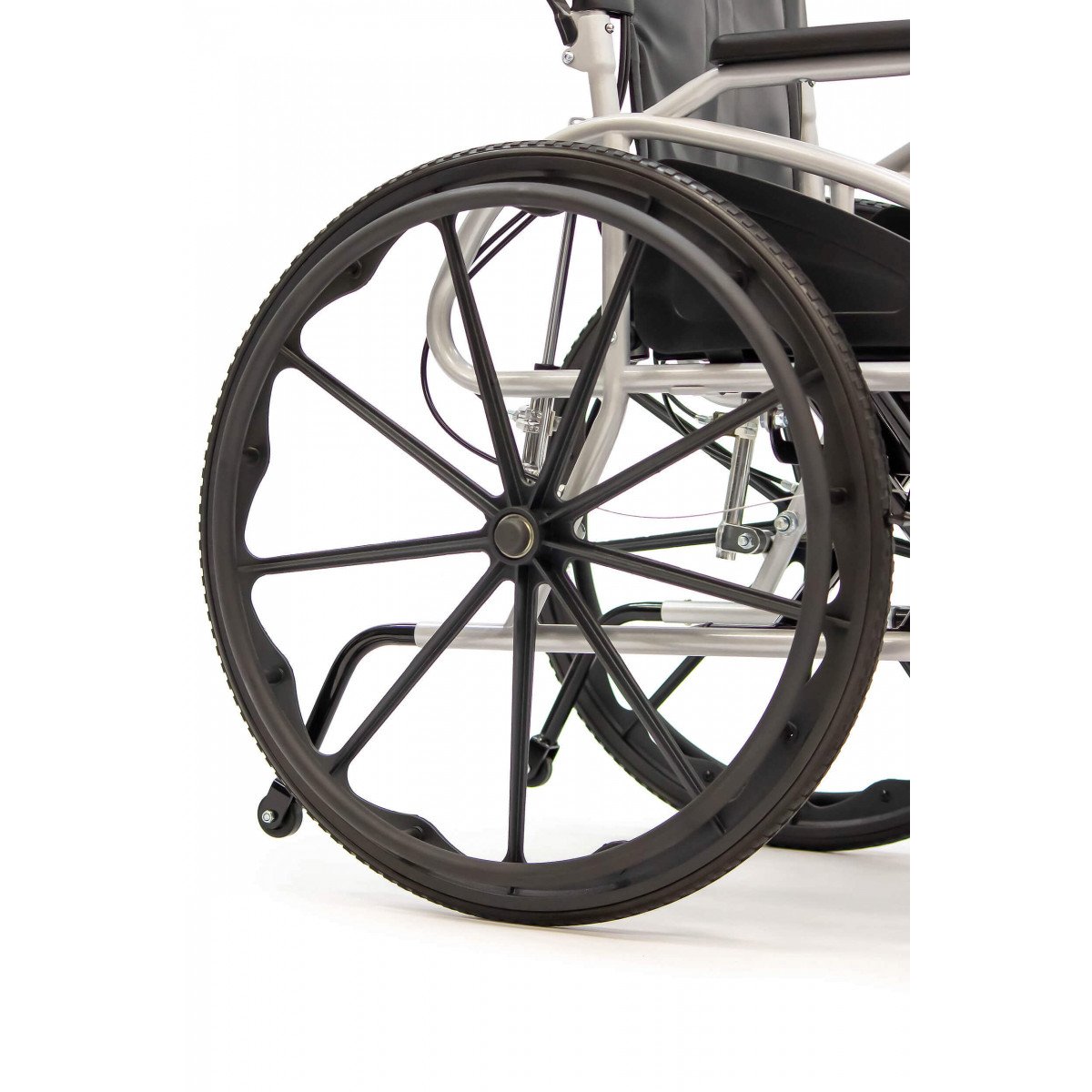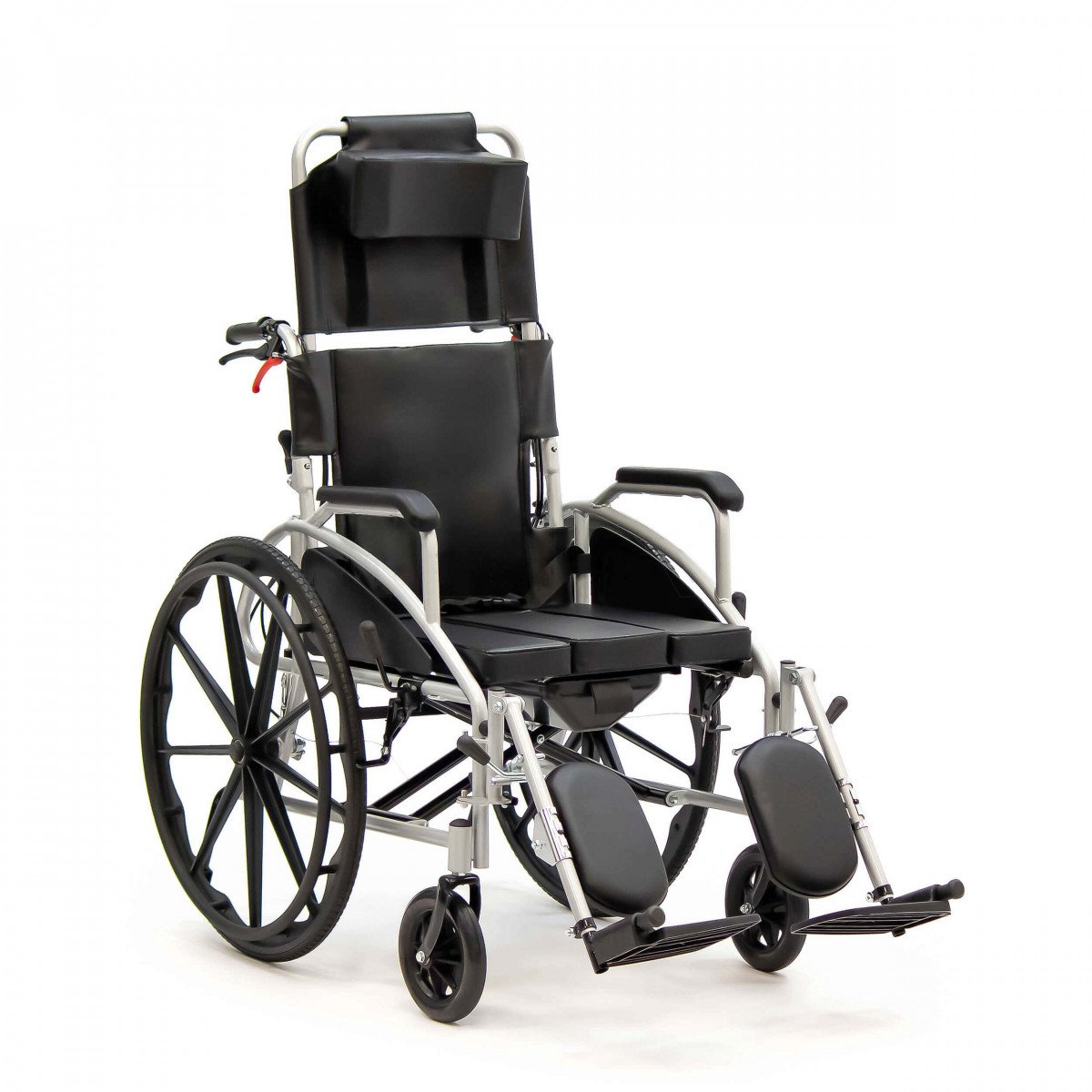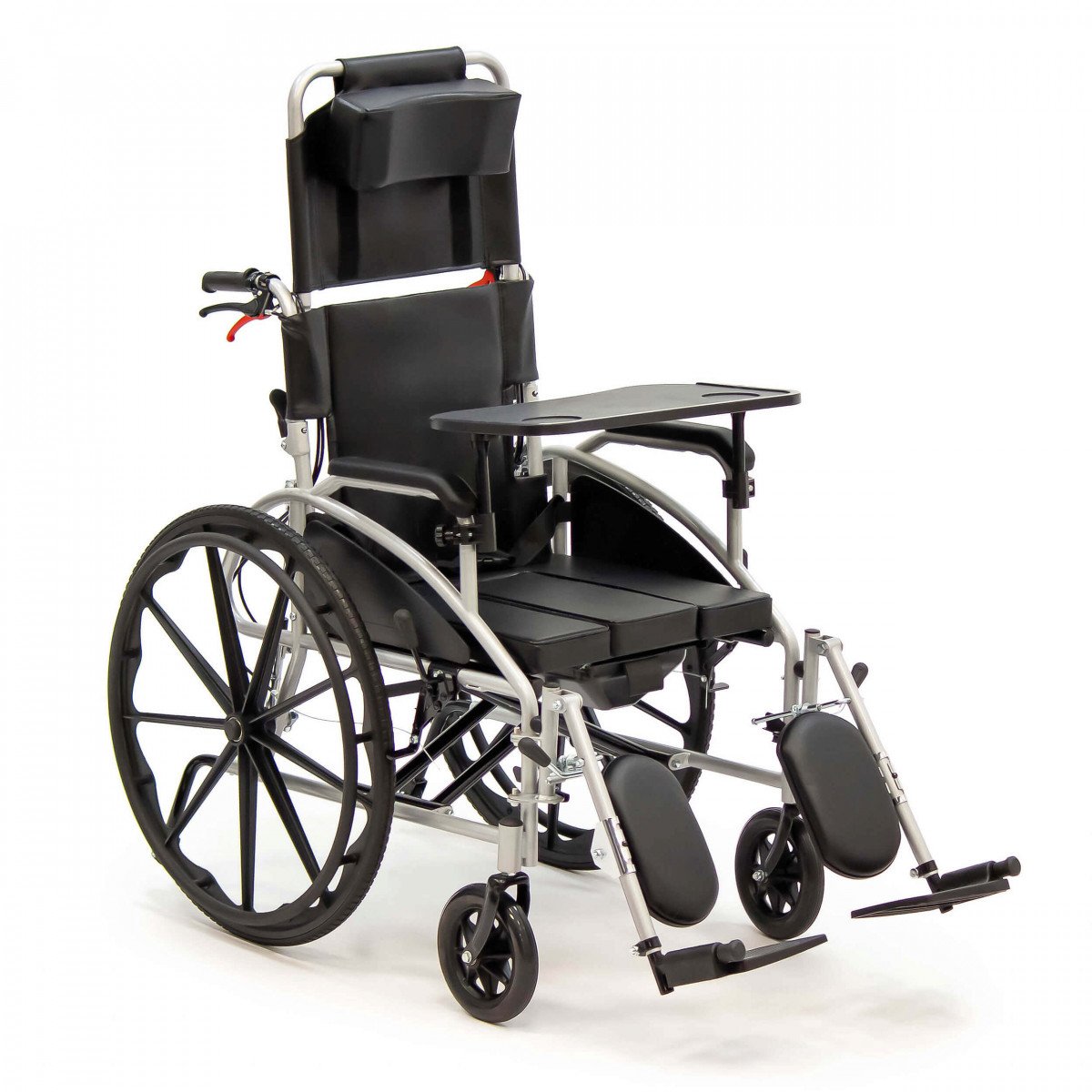 Сиденье из кожзаменителя легко очищается и подходит для регулярного ухода. Встроенное санитарное оснащение упрощает повседневные процедуры, а рифлёные обода облегчают управление. Модель продумана для пользователей с ограниченной подвижностью и тех, кому требуется больше поддержки в течение дня.