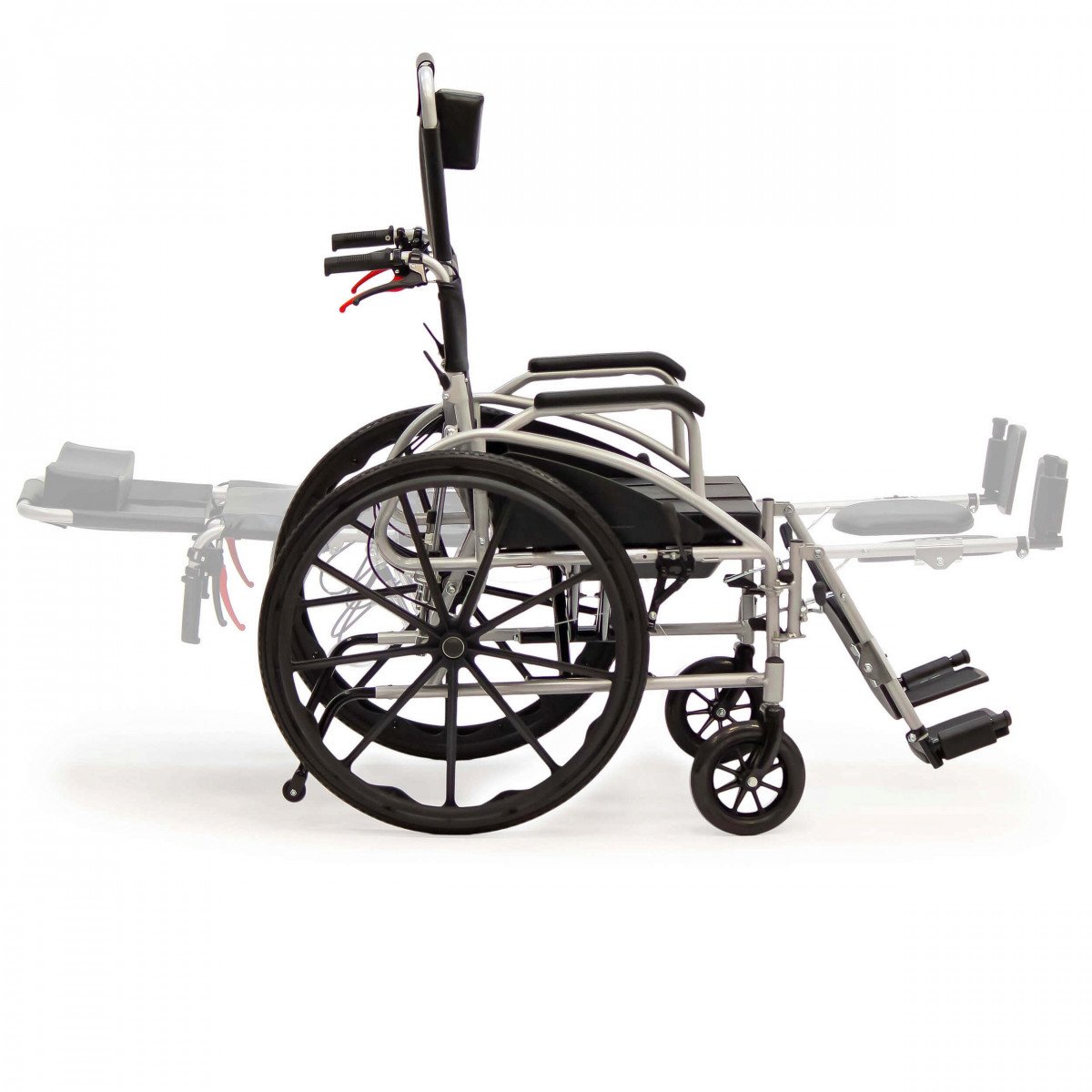 Конструкция позволяет быстро организовать лежачее место: спинка откидывается, подножки поднимаются до горизонтали, а съёмный удлинитель создаёт дополнительную опору для головы и шеи. Подголовник ограничивает лишние движения в шейном отделе, а упоры под голени подстраиваются под положение ног, снижая нагрузку и повышая комфорт.