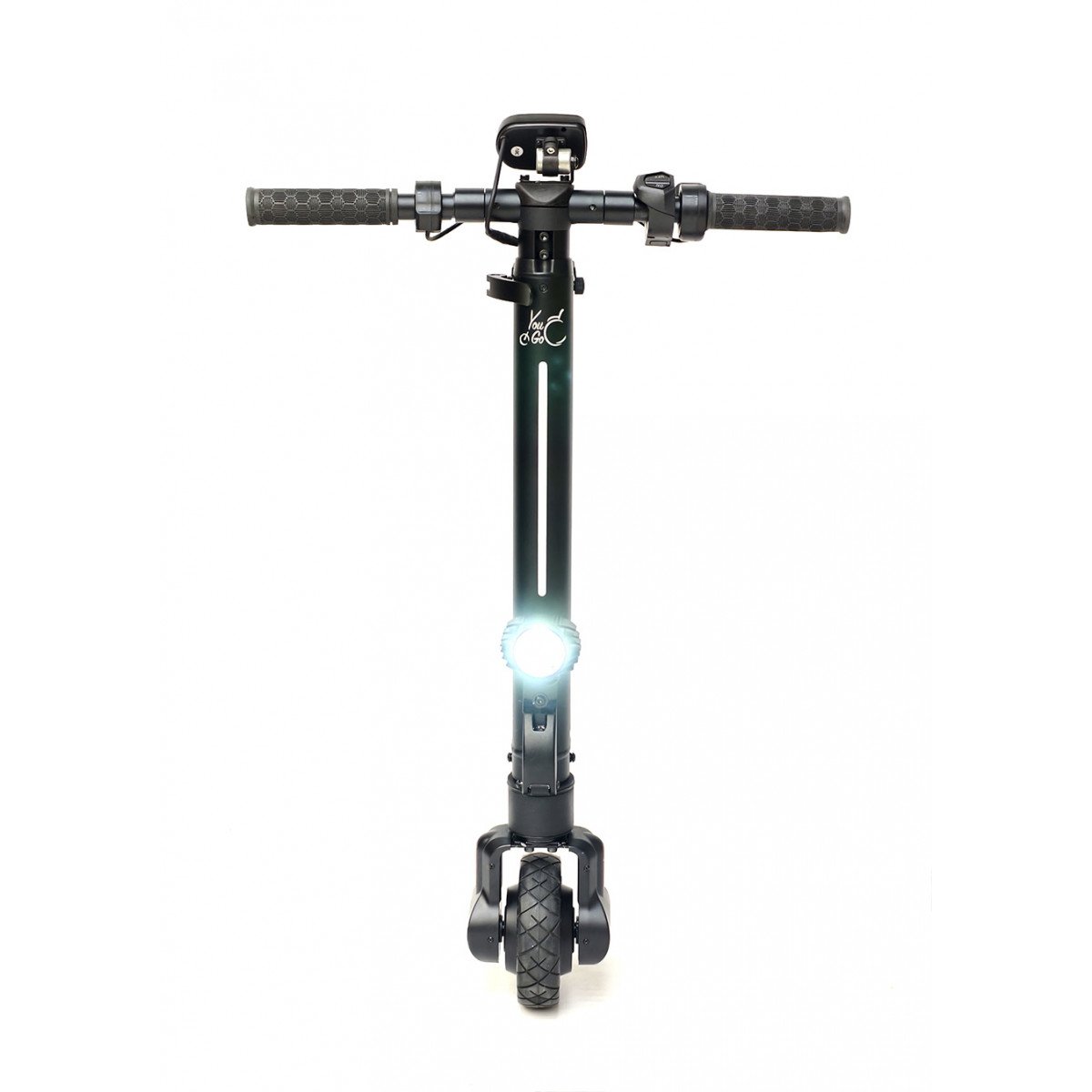 YouGo Лайт оснащена цельнолитым ведущим колесом с хорошим сцеплением и встроенной амортизацией, что обеспечивает уверенное движение по ровным покрытиям и подъёмам. Управление продумано до мелочей: курковый газ, электронный тормоз, реверс, звуковой сигнал и фара расположены на руле и доступны для управления одной рукой. Информативный дисплей отображает скорость, заряд аккумулятора и пробег, а также позволяет выбрать скоростной режим и при необходимости ограничить максимальную скорость.